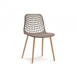 Conjunto de 4 sillas, modelo Mónica, base de metal con acabado imitación madera, asiento y respaldo de polipropileno inyectado de color negro o gris pardo.